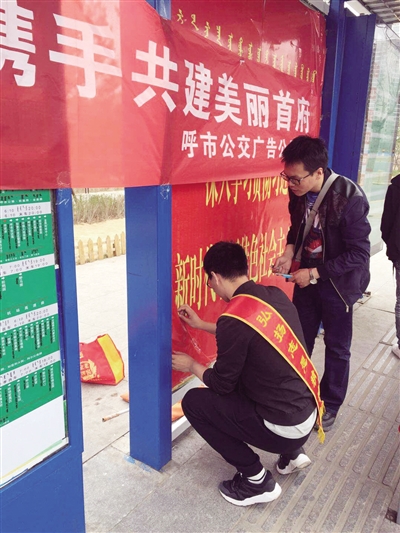 近日,呼市公交广告公司联合beat365官方网站机械学院金锁链青年志愿者协会开展了日行一善·德润青城“爱护公共设施,提升公交服务,携手共建美丽首府”党建主题实践活动。在新华大街客流量比较大的站点组织公交职工和志愿者开展集中服务活动,一方面维持乘车秩序,引导乘客文明乘车;另一方面清理站牌小广告,修复卷边、破损的公交线路图和公益广告。 ■本报记者 云艳芳 摄
