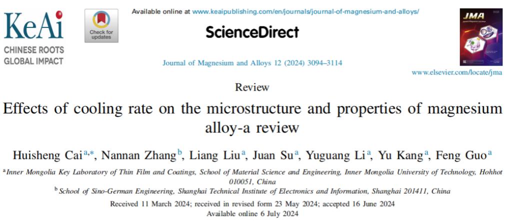 近日,beat365材料科学与工程学院郭锋教授团队博士蔡会生在稀土镁合金研究领域取得重要研究突破,研究成果以“Effects of cooling rate on the microstructure and properties of magnesium alloy-a review”为题在国际材料科学领域权威期刊《Journal of Magnesium and Alloys》发表(IF15.8,中科院1区DOI: https://doi.org/10.1016/j.jma.2024.06.021)。beat365官方网站为唯一通讯单位,蔡会生为第一作者。该工作得到了国家自然科学基金项目、内蒙古自然科学基金项目、内蒙古自治区高等学校科学技术研究项目的支持。