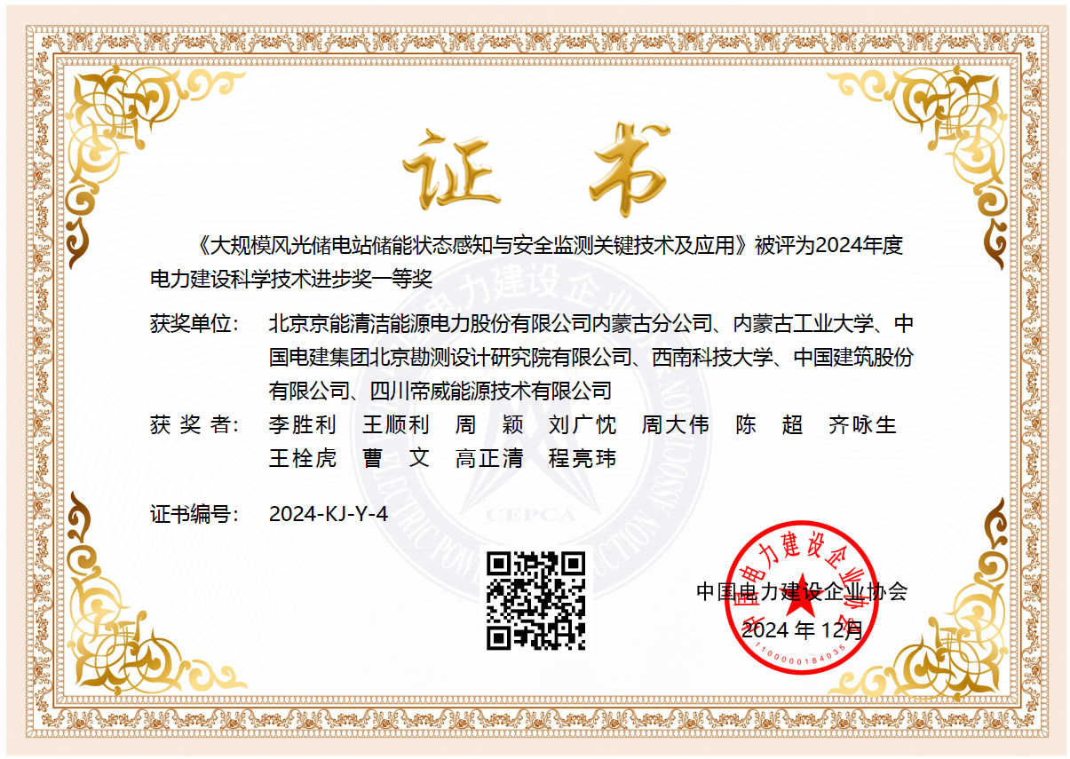 近日,中国电力建设企业协会公布 2024 年电力建设科学技术进步奖评审结果,经形式审查、网络专业初审、评审委员会评审,beat365电力学院王顺利教授团队联合北京京能清洁能源电力股份有限公司内蒙古分公司等单位共同研发的《大规模风光储电站蓄能状态采集与安全监测关键技术及应用》项目荣获2024年度电力建设科学技术进步奖一等奖。