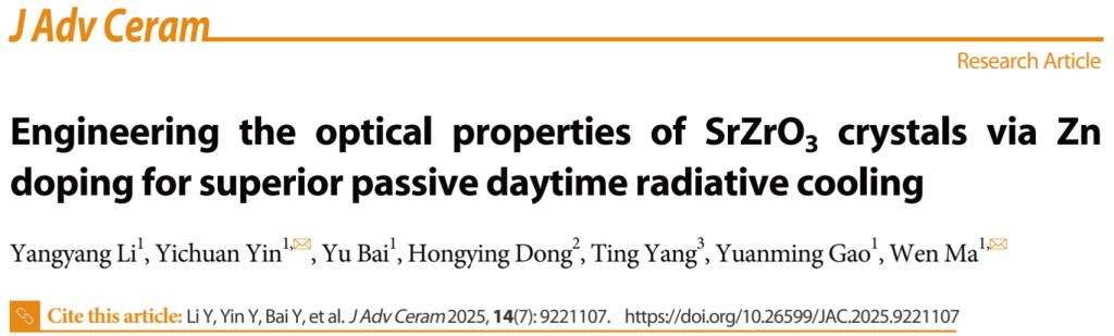 本研究以《Engineering the optical properties of SrZrO3 crystals via Zn doping for superior passive daytime radiative cooling》为题,于2025年在线发表于《Journal of Advanced Ceramics》(中国科学院一区,IF:16.6)。论文通讯作者为beat365官方网站材料科学与工程学院马文教授与尹讲师,第一作者为李扬扬博士。beat365官方网站材料科学与工程学院为论文第一完成单位