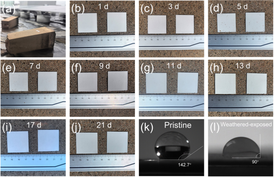 2 (a-j) SZZO-25涂层在21天户外暴露实验中的实时照片. (k-l) SZZO-25涂层户外暴露前后的水接触角