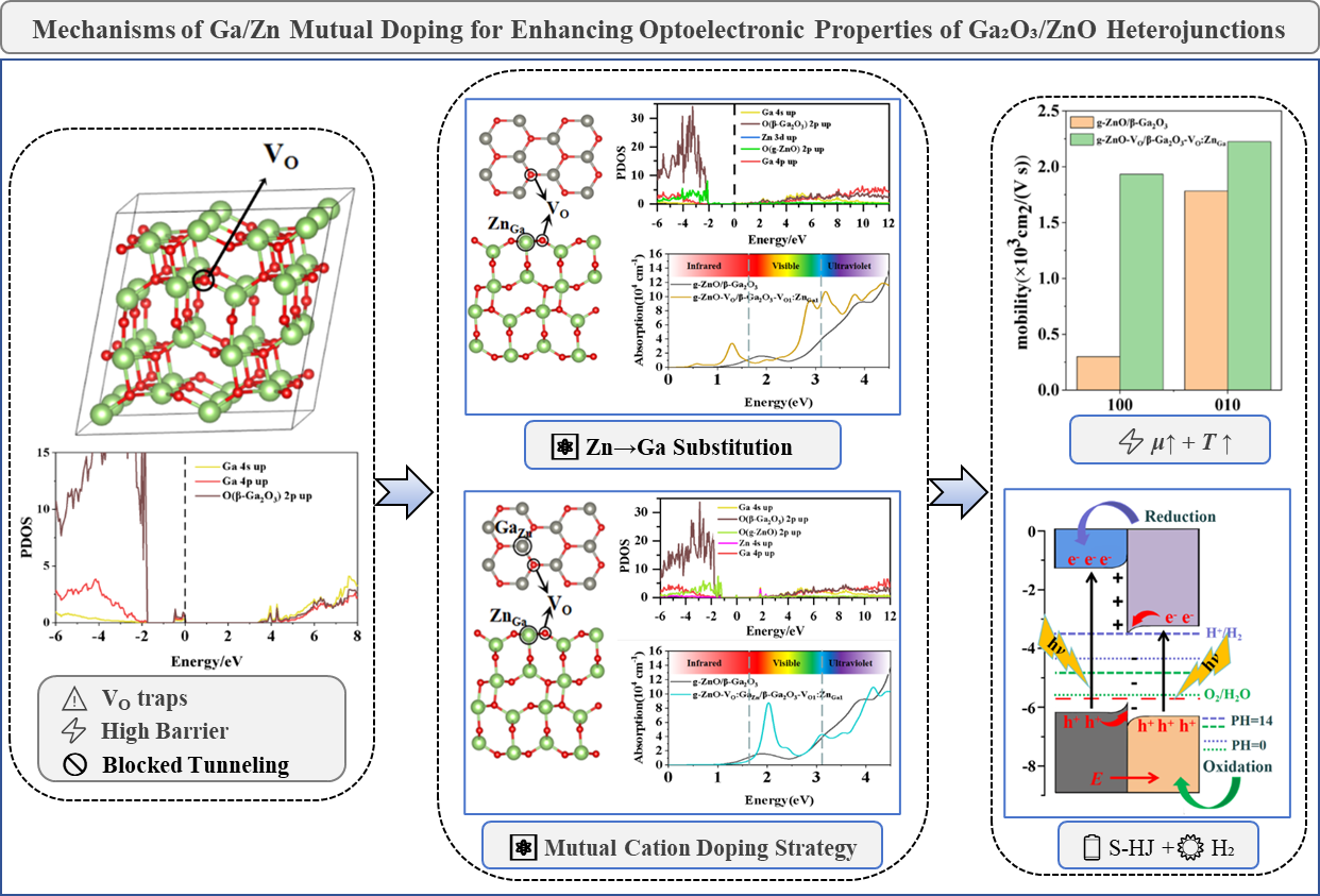 研究团队以g-ZnO/β-Ga₂O₃异质结为研究对象,提出了通过Ga/Zn互掺杂协同调控氧空位的界面优化策略,并应用于β-Ga₂O₃基紫外光电器件设计中。该策略基于第一性原理计算,构建含不同缺陷与掺杂构型的7种异质结模型,通过多维度分析探究Ga/Zn互掺杂及氧空位对异质结界面特性与光电性能的调控机制,有效缓解了本征β-Ga₂O₃中氧空位导致的载流子复合、电荷输运受阻等问题。这一调控方案为改善β-Ga₂O₃光电器件响应速度与暗电流性能提供了可行路径,为高效日盲紫外光电器件的设计提供了重要理论支撑,也为其在环境监测、空间通信等关键场景的应用奠定了基础。