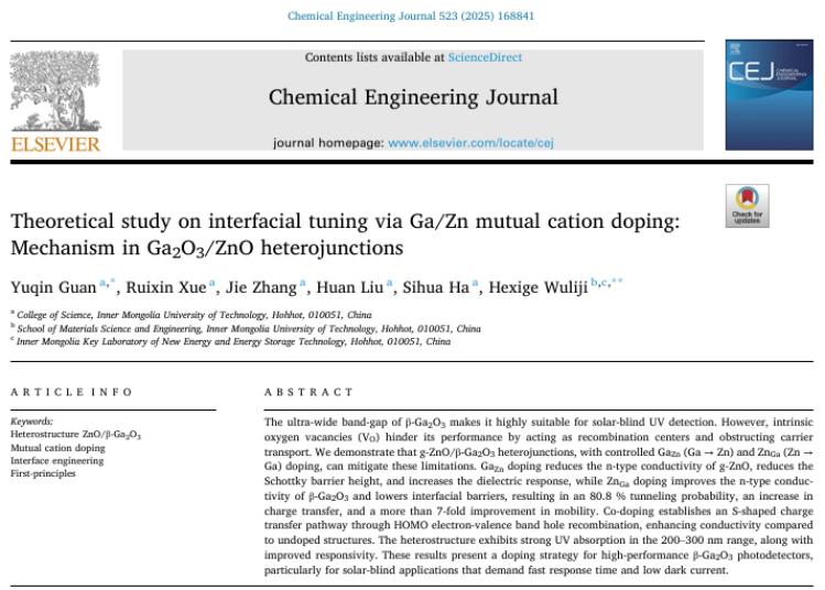 该研究成果受到国家自然科学基金项目(No.12164031);内蒙古自然科学基金项目(No.2023LHMS01004);内蒙古自治区高等学校科学研究项目(No.NJZY22376);自治区直属高校基本科研业务费项目(No.JY20250043)联合支持。相关研究文章“Theoretical study on interfacial tuning via Ga/Zn mutual cation doping: Mechanism in Ga2O3/ZnO heterojunctions”(DOI: https://doi.org/10.1016/j.cej.2025.168841)在国际期刊《Chemical Engineering Journal》(中国科学院1区 Top,IF:13.5)发表。beat365关玉琴副教授为第一作者,乌力吉贺希格博士为共同通讯作者,beat365官方网站为第一和唯一通讯单位。