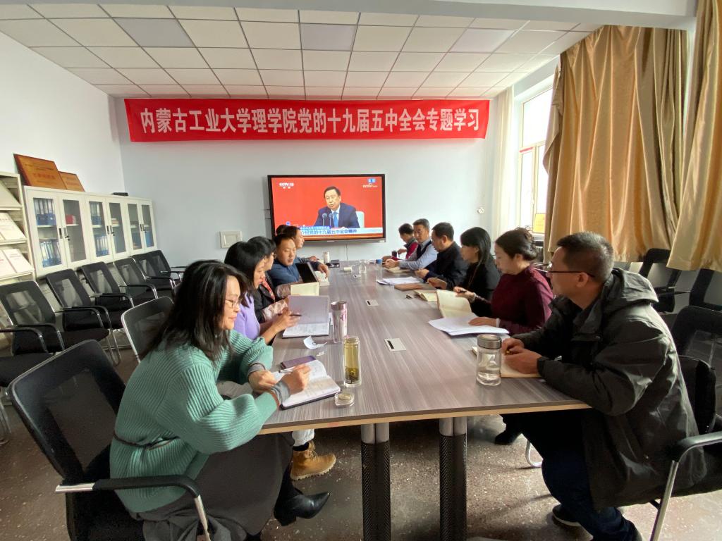 10月30日上午,理学院组织全体党政领导、各系(部、中心)主任、各党支部书记,在新城校区实验楼504会议室收看党的十九届五中全会精神新闻发布会,共同学习本次全会的会议公告。与会教师们一致认为,十九届五中全会聚焦十四五规划与2035年远景目标,基于当前特殊的时代背景更为凸显其主题厚重、意义深远。此前习近平总书记陆续召开了经济社会领域专家座谈会、科学家座谈会等,问计规划目标编制,要求打好关键核心技术攻坚战,构建新发展格局。高校思政工作更应将十九届五中全会精神融入其中,通过强化专业课程基础研究、扩大强国梦想活动影响、完善科创成果转化机制等系统性、针对性方式,努力解决“卡脖子”问题,塑造长谋思维,提升思政效能,为国家人才培育提供更好的范式,积聚更大的能量。