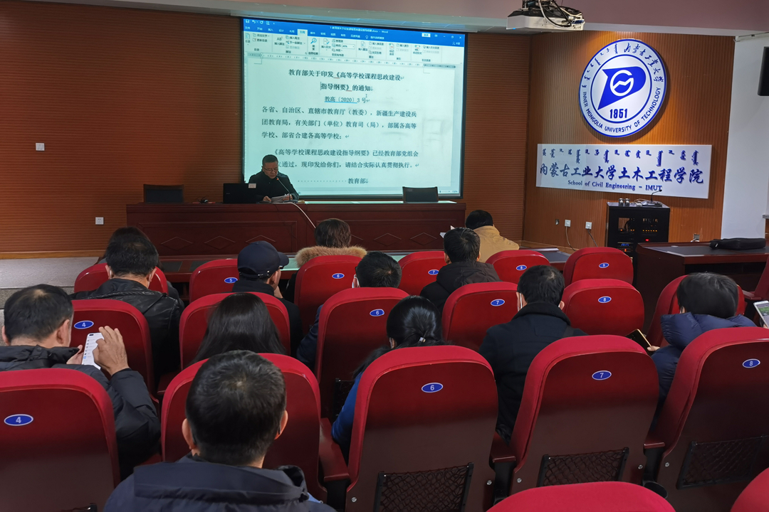 为加强思想政治队伍建设,全面推进课程思政建设工作,12月3日下午,土木工程学院党委组织全体教职工在新城校区土木馆B219召开大会,集体学习教育部等八部门关于《加快构建高校思想政治工作体系的意见》和教育部关于《高等学校课程思政建设指导纲要》等文件精神。学习会由学院党委书记那音巴雅尔主持。