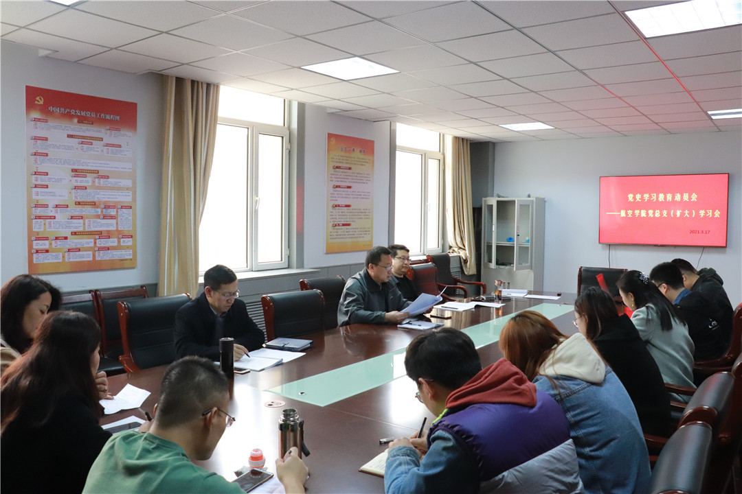 3月17日下午,航空学院党总支在学院党员活动室组织召开党史学习教育动员会。党总支成员、各党支部书记和支部委员参加会议。党总支书记郭凌峰主持会议。