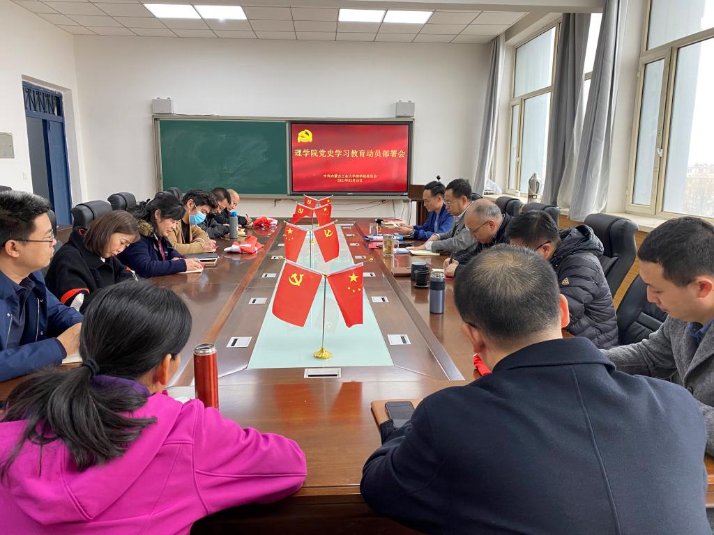 会上集体学习了习近平总书记在全国党史学习教育大会上的重要讲话精神和学校党委关于党史学习教育的安排部署;学院党委副书记、副院长李强传达了学校党史教育动员部署大会精神,并对理学院开展党史学习教育作了具体安排部署。