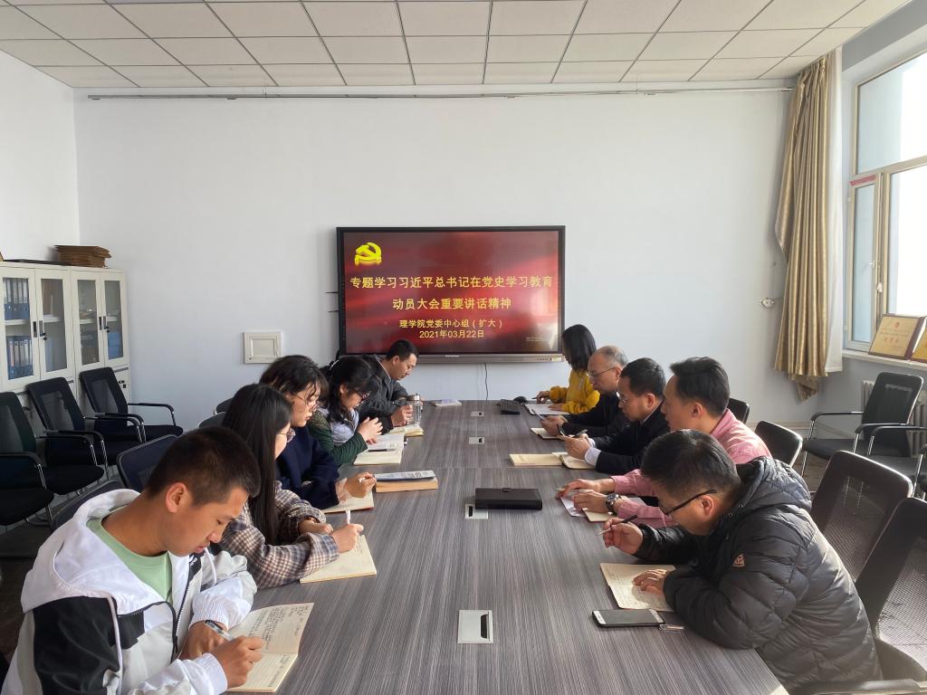 3月22日上午,理学院党委理论学习中心组(扩大)专题学习习近平总书记在党史学习教育动员大会上的重要讲话精神。学院领导、师生党支部书记参加会议。党委副书记、院长庞晶主持会议。