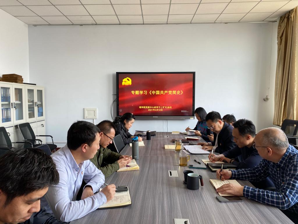 4月14日下午,理学院党委理论学习中心组在新城校区实验楼504会议室专题学习《中国共产党简史》。学院领导班子成员、全体党支部书记参加,学院党委副书记、院长庞晶主持。