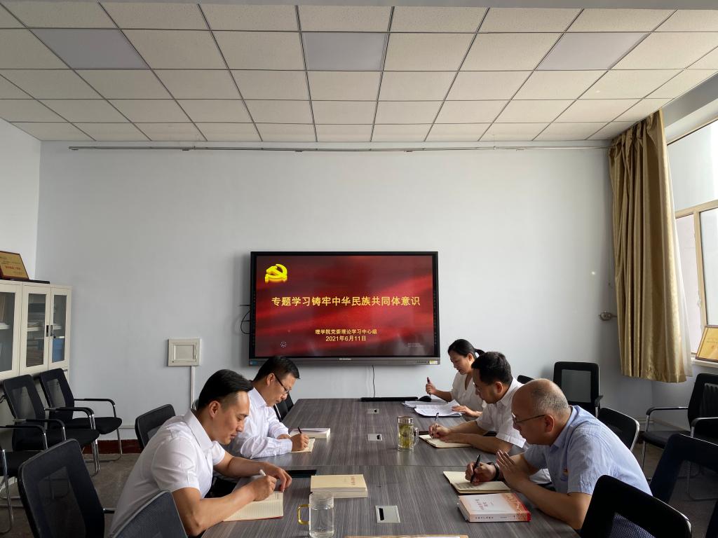 6月11日上午,理学院党委理论学习中心组在新城校区实验楼504会议室开展铸牢中华民族共同体意识专题学习。中心组成员参加学习,院党委副书记、院长庞晶主持会议。