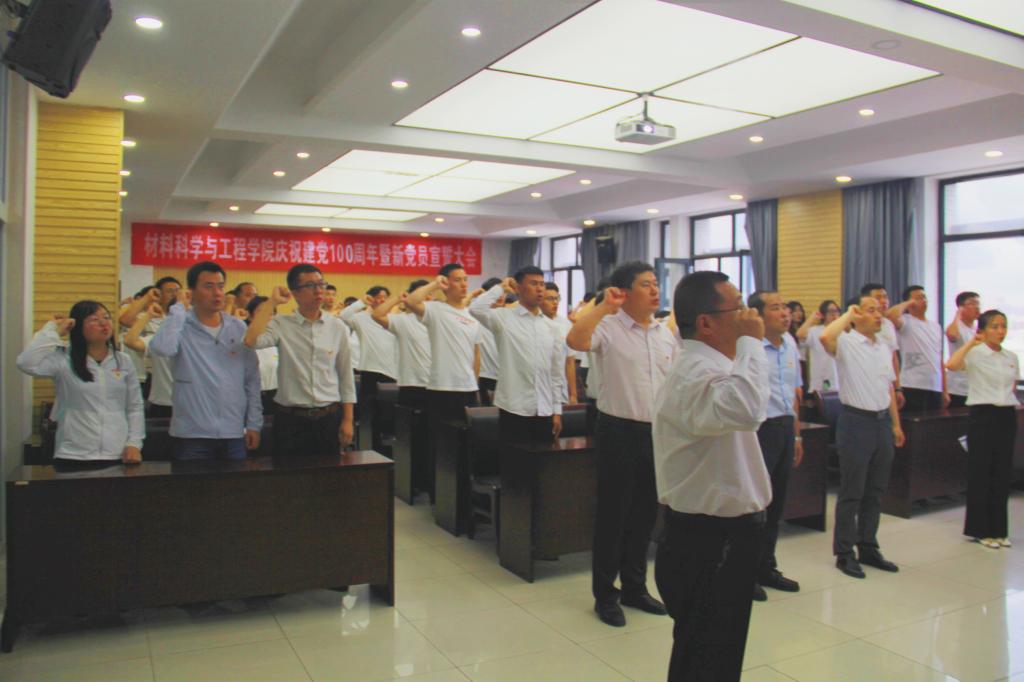 为庆祝中国共产党成立100周年,进一步增强大学生党员党性意识,激励广大青年学生坚定信念、对党忠诚、勇于担当、无私奉献,6月16日晚,材料科学与工程学院党委在新城校区工程技术楼512室隆重召开庆祝中国共产党成立100周年新党员入党宣誓大会。学院党委书记白朴存,副书记、副院长吕凯,群工委员、副院长刘景顺,组织委员李国伟,学院各党支部书记、党员代表等80余人参会。学院党委组织员菅妮主持会议。
