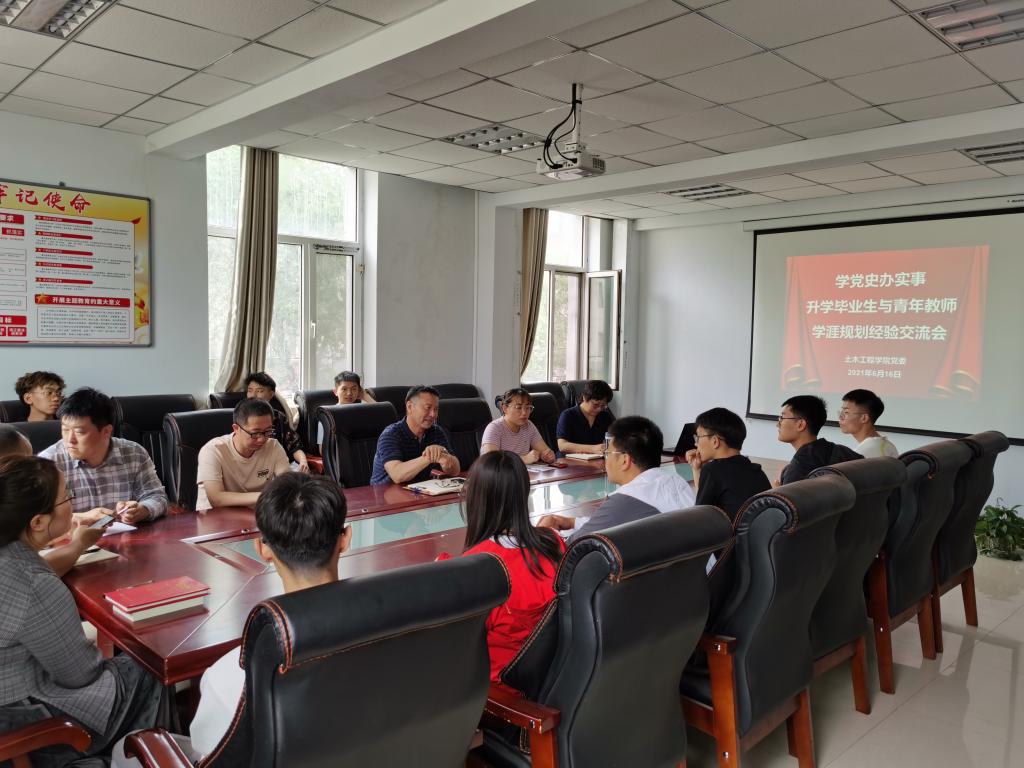 6月16日下午,土木工程学院在新城校区土木馆C座333会议室举办“学党史办实事”升学毕业与青年教师学涯规划经验交流会。田亚峰、杜强、贾子乐、王娟、常琛、郝秀娟等6位“双一流”高校毕业或区外高校毕业的青年博士教师代表和下学期即将攻读硕士学位的毕业生代表30余人参加会议。会议由党委书记那音巴雅尔主持。