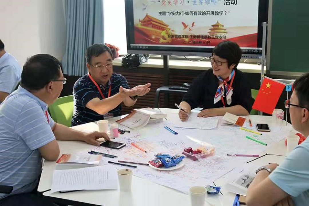近日,经济管理学院党委围绕“学史力行·如何有效开展教学”主题,创造性地将“世界咖啡”这种学习形式运用到党史学习教育中,活动全程运用党建抖音进行直播。专题活动由工商管理系党支部策划和组织,学院各党支部书记代表参加。这种创新党史学习教育载体的专题活动,吸引众多师生参与并获得一致好评。