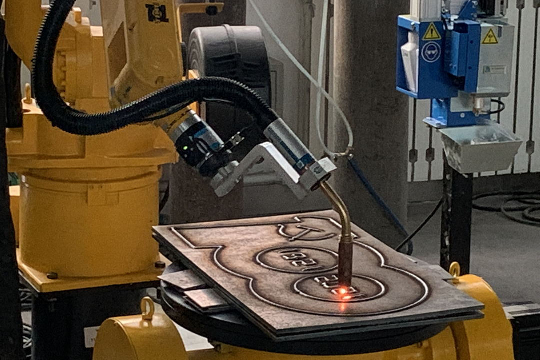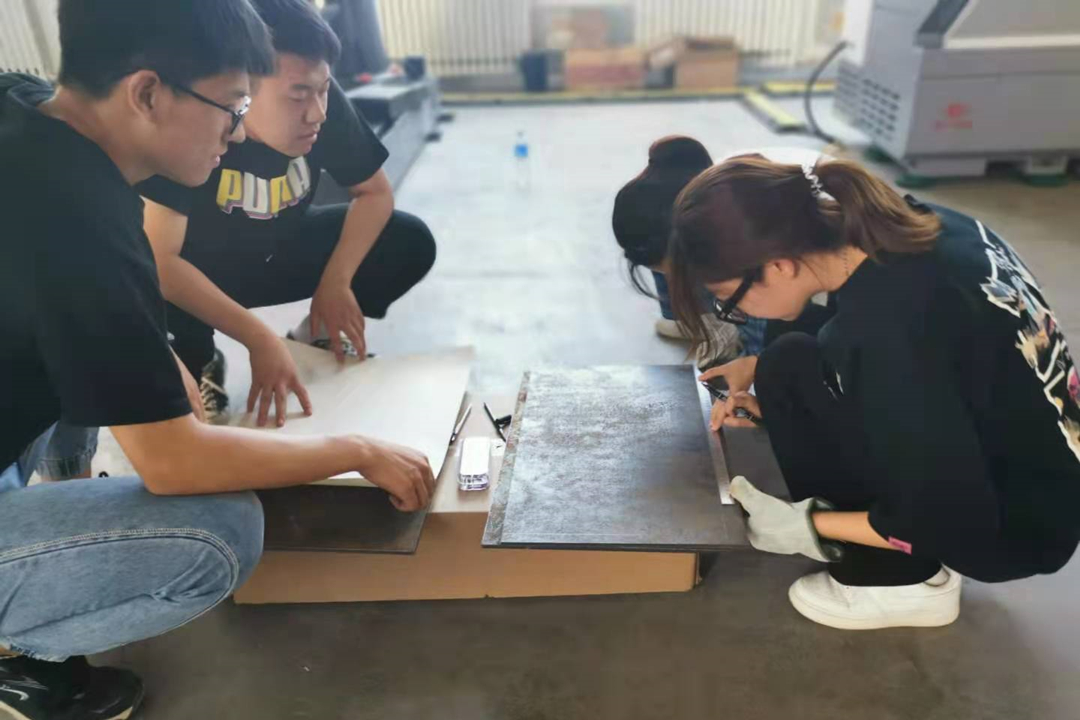 同学们在焊接专业老师的指导下,一次次讨论、一遍遍修改、一步步优化构思设计、图案制作、工艺调试等阶段。为保证成行美观,每一个关键位置的选择及确定都至关重要,需多次进行设计模拟。最终选取8毫米厚钢板为基板,采用机器人焊接技术,选用氩气-二氧化碳混合气体保护焊。在焊接过程中,多次对焊接电流、电压、焊接速度及焊丝长度等参数进行优化对比,以保证余高合适,宽窄均匀、成型美观。开展焊接实践不仅使理论与实践相融合,也考验运行程序的编写能力,又锻炼了实操能力,以及学生的逻辑思维能力对焊接结果都会有一定的影响。