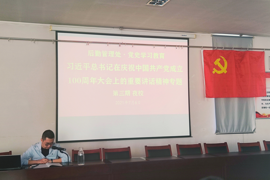根据校党委党史学习教育领导小组关于党史学习教育安排部署,7月6日晚,后勤管理处党总支开展党史学习教育第三期夜校,专题学习习近平总书记在庆祝中国共产党成立100周年大会上的重要讲话。后勤管理处党总支全体党员、入党积极分子参加本期夜校学习。