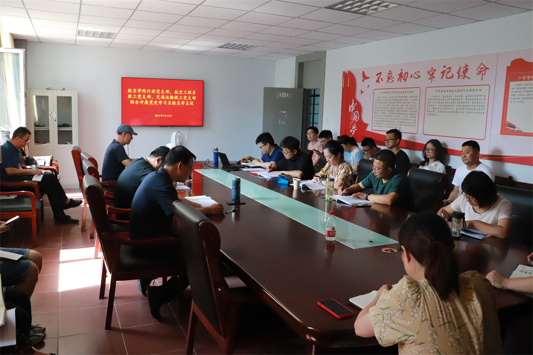 7月13日下午,航空学院行政党支部、航空工程系教工党支部、交通运输系教工党支部联合开展互检互学互促活动,共同研讨《习近平总书记在庆祝中国共产党成立100周年大会上重要讲话》。三个教工党支部的党员教师参加活动。