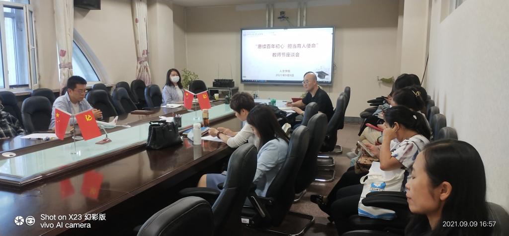 9月9日下午,人文学院在金川校区电力大楼331会议室召开以“赓续百年初心 担当育人使命”为主题的教师节座谈会,庆祝第37个教师节。学院党委书记马利强主持会议,全体教职工参会。