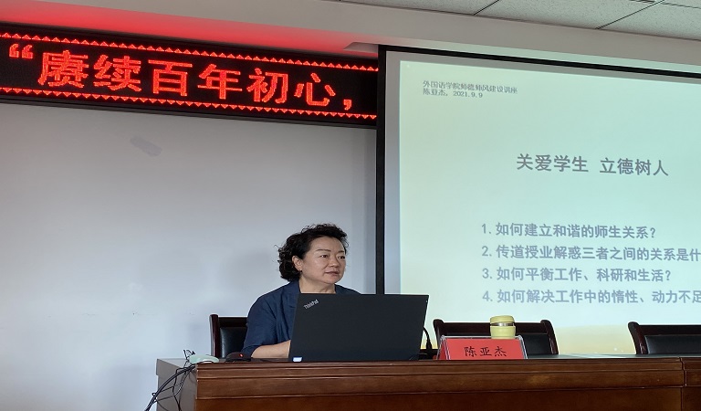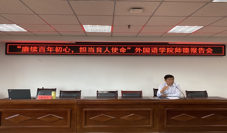 9月9日下午,外国语学院在金川校区电力大楼401报告厅举办“赓续百年初心,担当育人使命”师德报告会。2020年校师德标兵陈亚杰教授为全体教师作“关爱学生、立德树人”报告。报告会由学院党委书记霍天瑞主持。