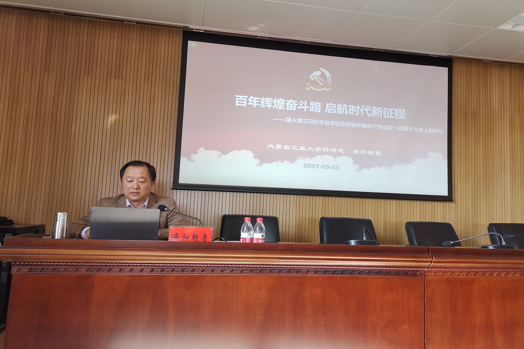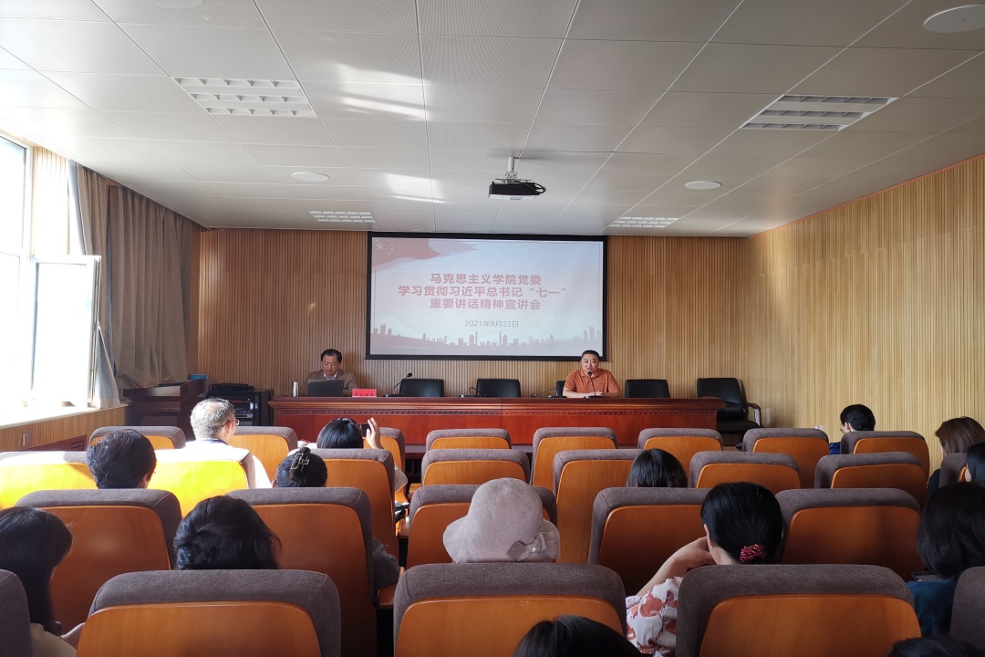 为深入学习贯彻习近平总书记在中国共产党成立100周年庆祝大会上的重要讲话精神,全面推进党史学习教育走深走实,按照学校党委的安排和部署,9月23日下午,马克思主义学院党委召开学习贯彻习近平总书记“七一”重要讲话精神宣讲会。本次宣讲会由学校党委宣讲团成员、科研处副处长布和朝鲁教授进行宣讲。学院党委书记王文华主持宣讲会。