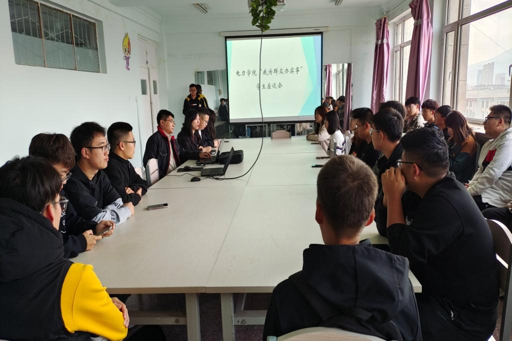 10月14日,电力学院在金川校区电力大楼0804举办“我为群众办实事”座谈会。学院党委副书记、副院长董小倩,团学办公室老师王宇辰和50名学生代表参加座谈会。