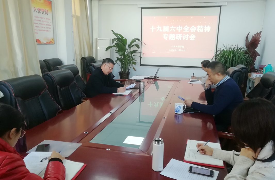 11月25日上午,土木工程学院党委在新城校区土木馆C333会议室召开党的十九届六中全会精神研讨会。院领导、党委委员参加会议。会议由院党委书记那音巴雅尔主持。