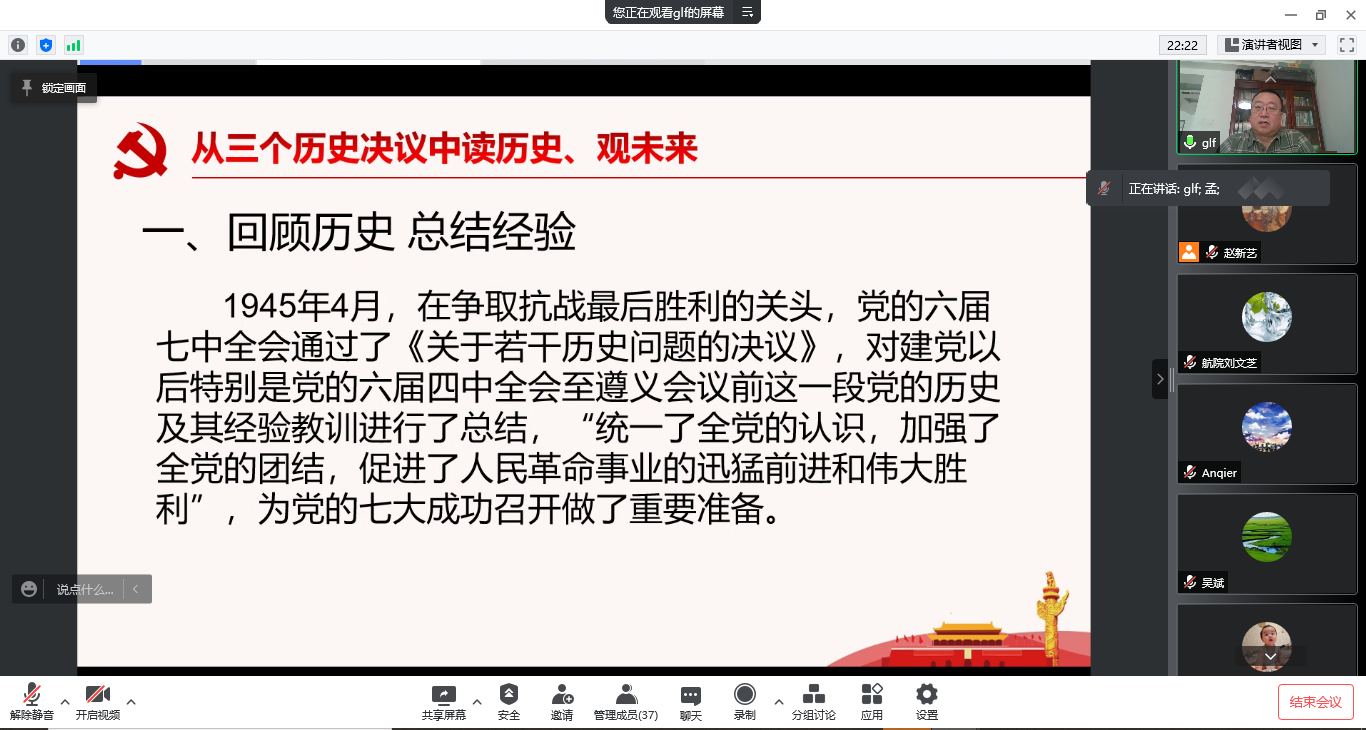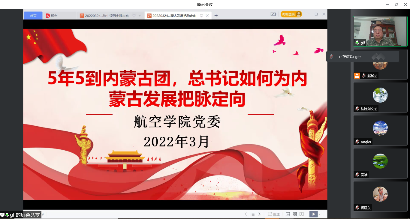 3月24日下午,航空学院党委组织全体教师在线集中学习党的十九届六中全会精神以及习近平总书记在参加十三届全国人大五次会议内蒙古代表团审议时重要讲话精神。学院党委书记郭凌峰主持会议。