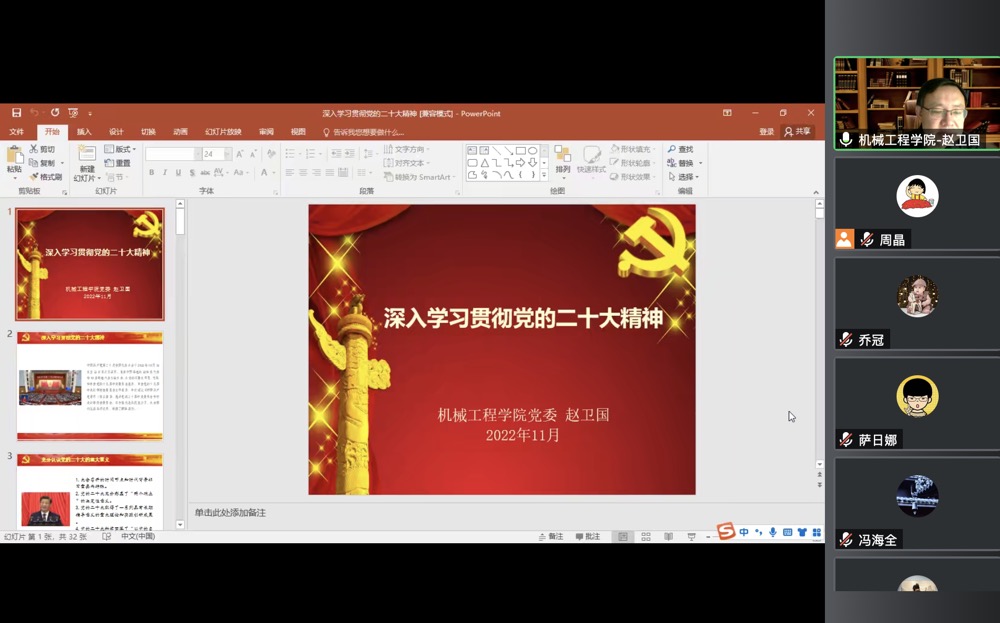为深入学习宣传贯彻党的二十大精神,11月28日机械工程学院党委举办党的二十大精神专题党课,学院党委书记赵卫国主讲,学院全体教师线上聆听党课。