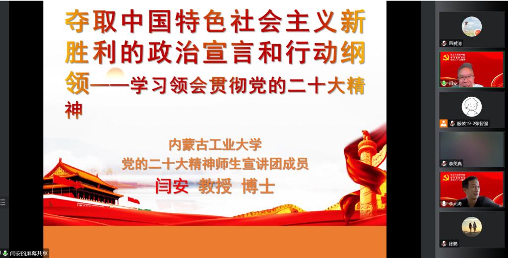 闫安教授从“充分认识党的二十大的重大意义”“全面准确学习领会党的二十大精神”“全面学习、全面把握、全面落实推动党的二十大精神在内蒙古落地生根、开花结果”3个方面,聚焦党的二十大的重要意义、过去5年的工作和新时代10年的伟大变革、马克思主义中国化时代化、中国式现代化、坚持党的领导和全面从严治党、团结奋斗的时代要求等内容,对党的二十大精神进行了详细解读。宣讲报告主题鲜明、内容丰富、思想深刻,对全体参会人员全面准确学习领会党的二十大精神具有重要指导意义。