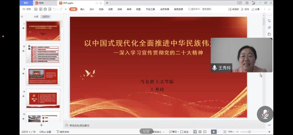 王秀玲教授以“中国式现代化全面推进中华民族伟大复兴——深入学习宣传贯彻党的二十大精神”为题,从大会的战略定位、大会主题、实践基础、理论指导、基本路径、根本保证、团结要求等方面,结合详实数据、生动案例对党的二十大提出的新思想新论断、作出的新部署新要求进行了全面宣讲和深入阐释。