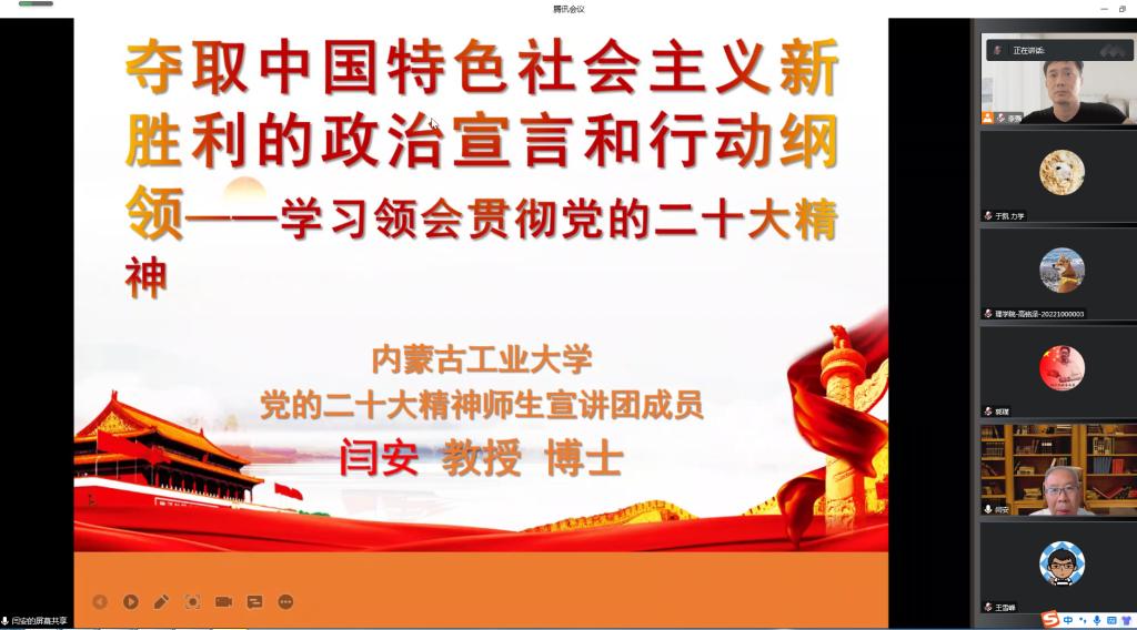 闫安以“夺取中国特色社会主义新胜利的政治宣言和行动纲领——学习领会贯彻党的二十大精神”为题,重点围绕充分认识党的二十大的重大意义、全面准确学习领会党的二十大精神全面学习把握落实推动党的二十大精神在内蒙古落地生根开花结果等3个方面,对党的二十大精神进行了深入阐释和系统解读。宣讲报告主题鲜明、深入浅出,与会师生一致认为对准确领会和全面把握党的二十大精神的丰富内涵和精髓要义,切实增强贯彻落实的自觉性和坚定性起到了重要指导意义。