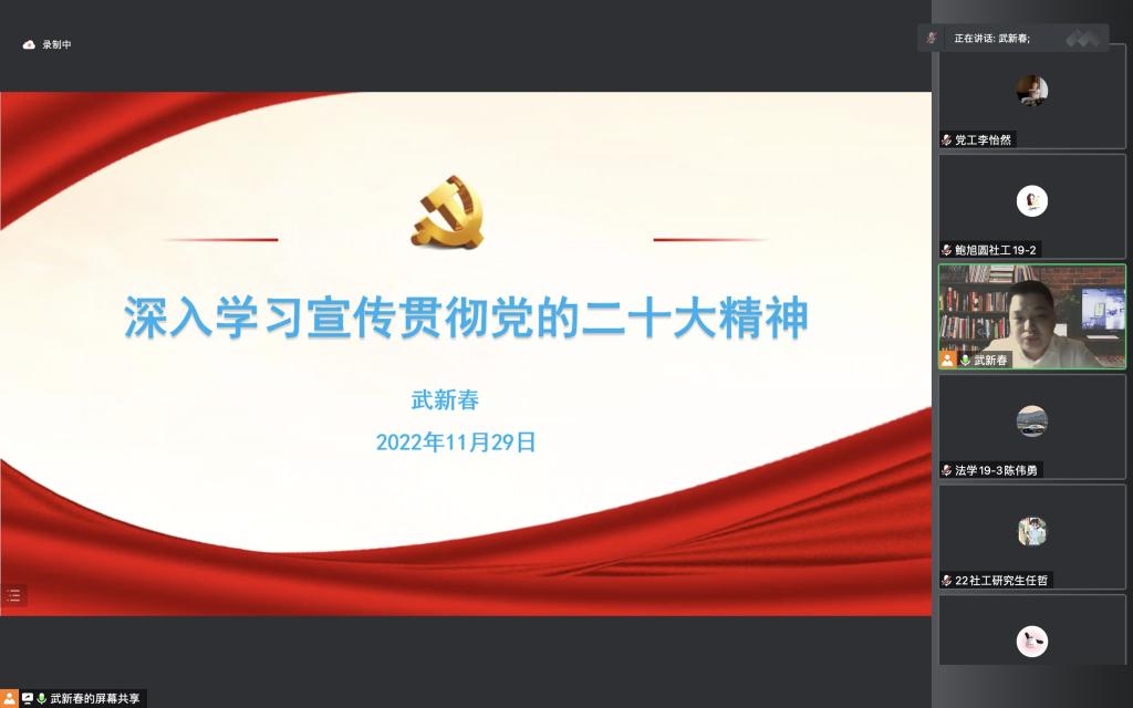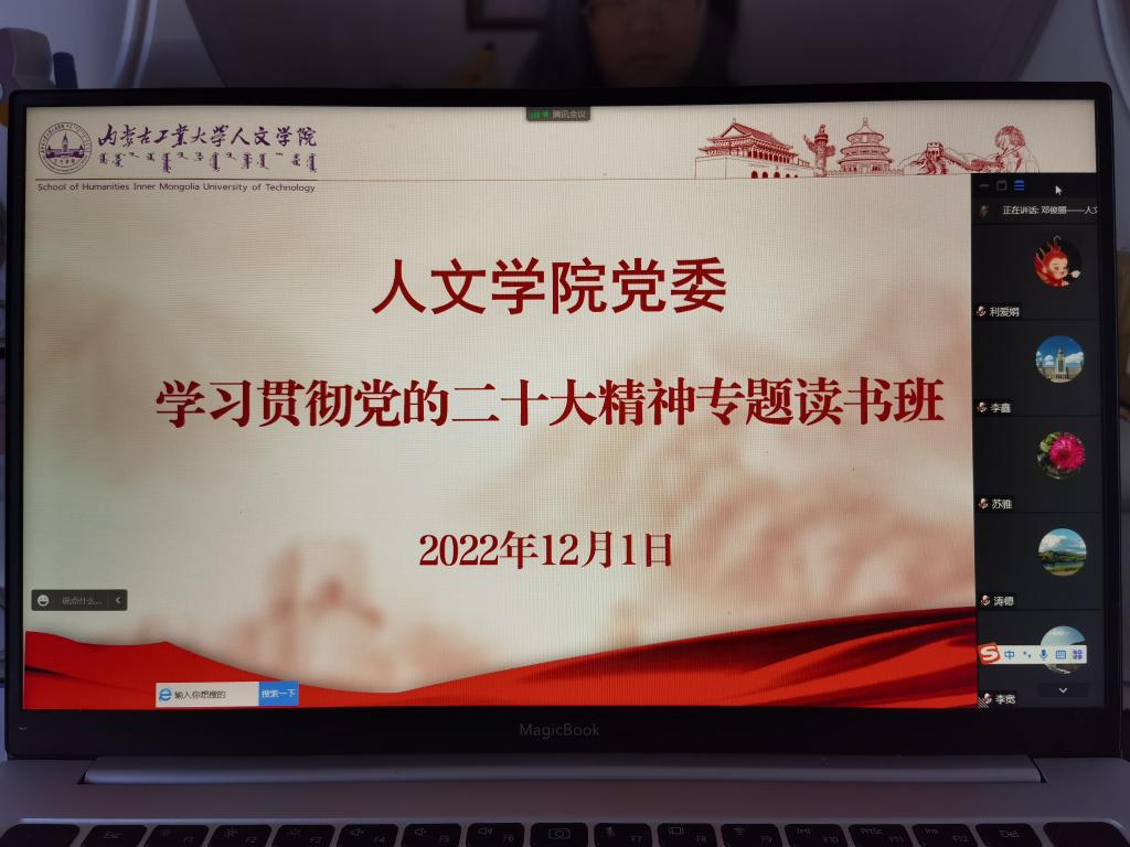 11月27日至12月1日,人文学院举办学习贯彻党的二十大精神专题读书班。学院党委书记马利强,党委副书记、院长郝晓燕,党委副书记、副院长武新春,学校党的二十大精神宣讲团成员、马克思主义学院马立国教授分别作主题宣讲。学院全体教师、学生党员、发展对象和入党积极分子参加。