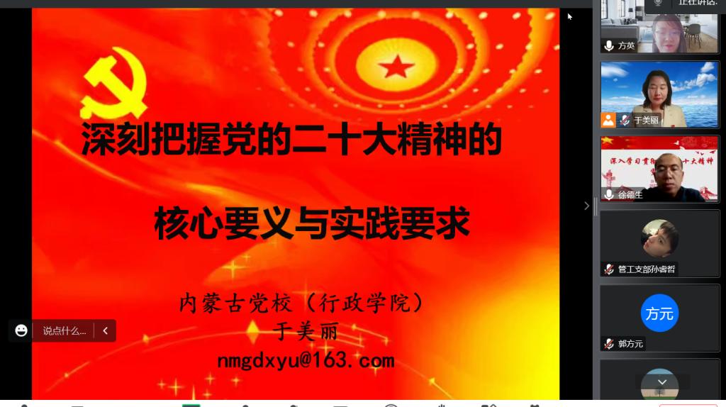12月9日下午,经济管理学院党委召开学习贯彻党的二十大精神专题宣讲会,邀请内蒙古自治区党校党史党建教研部于美丽副教授作宣讲报告。学院党委副书记、副院长徐德生主持报告会。学院全体教师、学生党员及发展对象线上参加此次报告