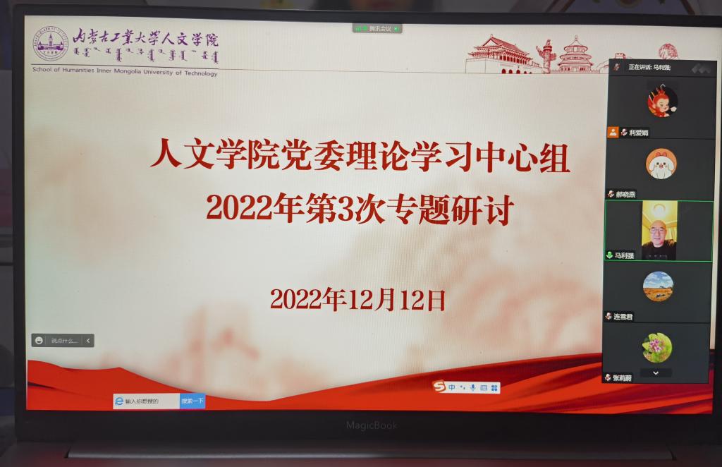 12月12日,人文学院党委理论学习中心组举行2022年第3次专题研讨院党委书记马利强主持会议。中心组全体成员结合前期自学党的二十大报告关于科教兴国战略的重要论述、beat365“十四五”发展规划及子规划内容,围绕“落实党的二十大科教兴国战略部署,科学谋划学院十四五发展规划”主题交流发言。