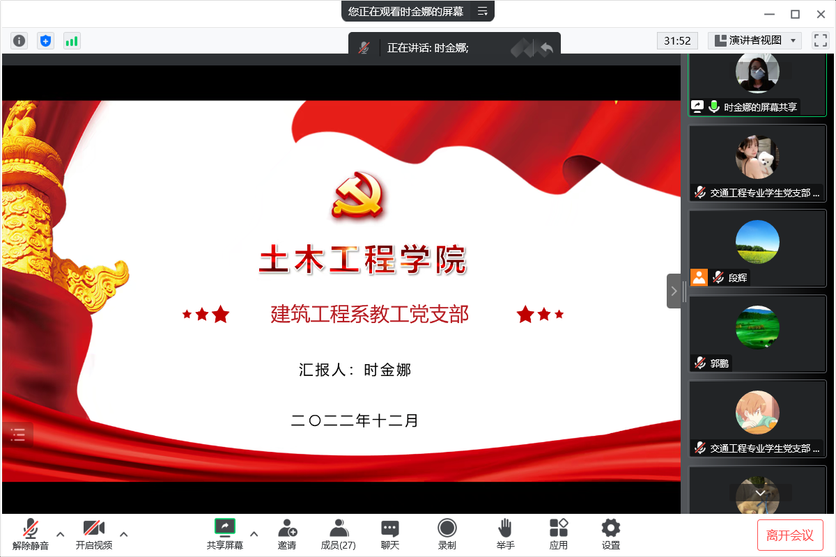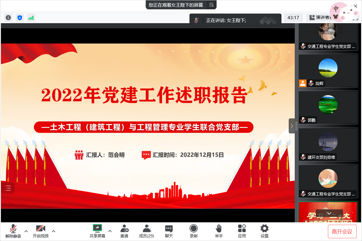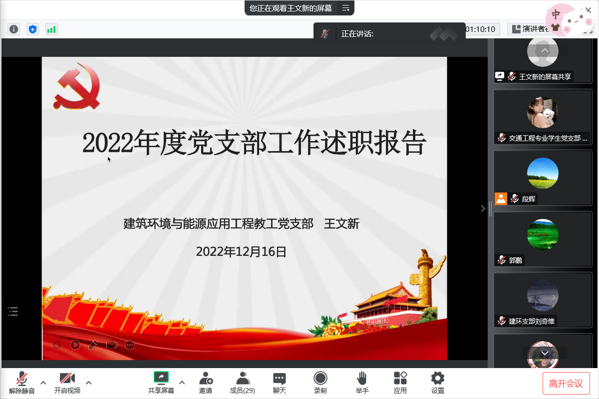 为进一步夯实基层党建工作,加强支部建设,提升履职尽责能力,根据校党委有关工作要求,12月15日下午,土木工程学院党委线上召开2022年度党支部书记述职报告会。学院全体党委委员、党支部书记、支委代表共29人参加会议。党委副书记、副院长郭鹏主持述职会。