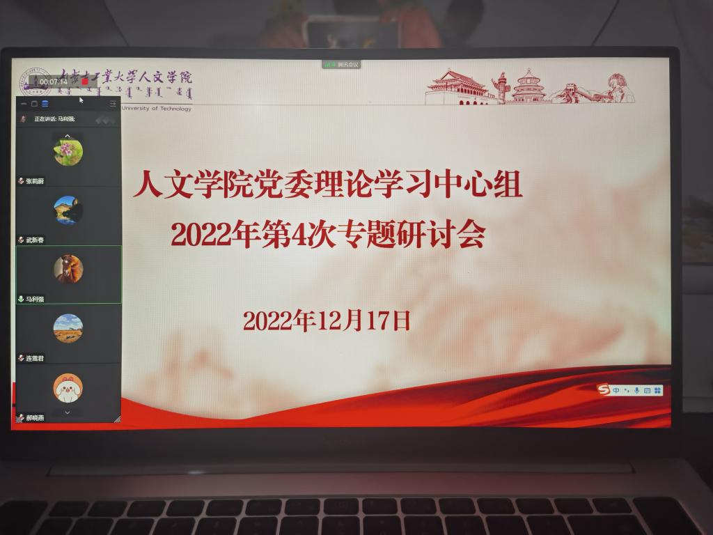 12月17日,人文学院党委理论学习中心组线上举行2022年第4次专题研讨。学院党委书记马利强主持会议,学院党委委员参加。