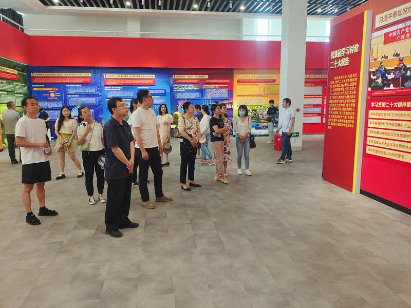 展览通过“新时代伟大成就”“高举伟大旗帜”“创造新的伟业”3个单元形象生动解读党的二十大精神全貌,全面立体呈现在习近平总书记的亲切关怀和党中央的坚强领导下,内蒙古十年来在经济、文化、社会等领域所取得的辉煌成就,以及全区各地各单位认真学习贯彻党的二十大精神的具体举措和实际行动。大家仔细观看展览,认真听取讲解,详细了解有关情况,并相互交流参观心得体会。