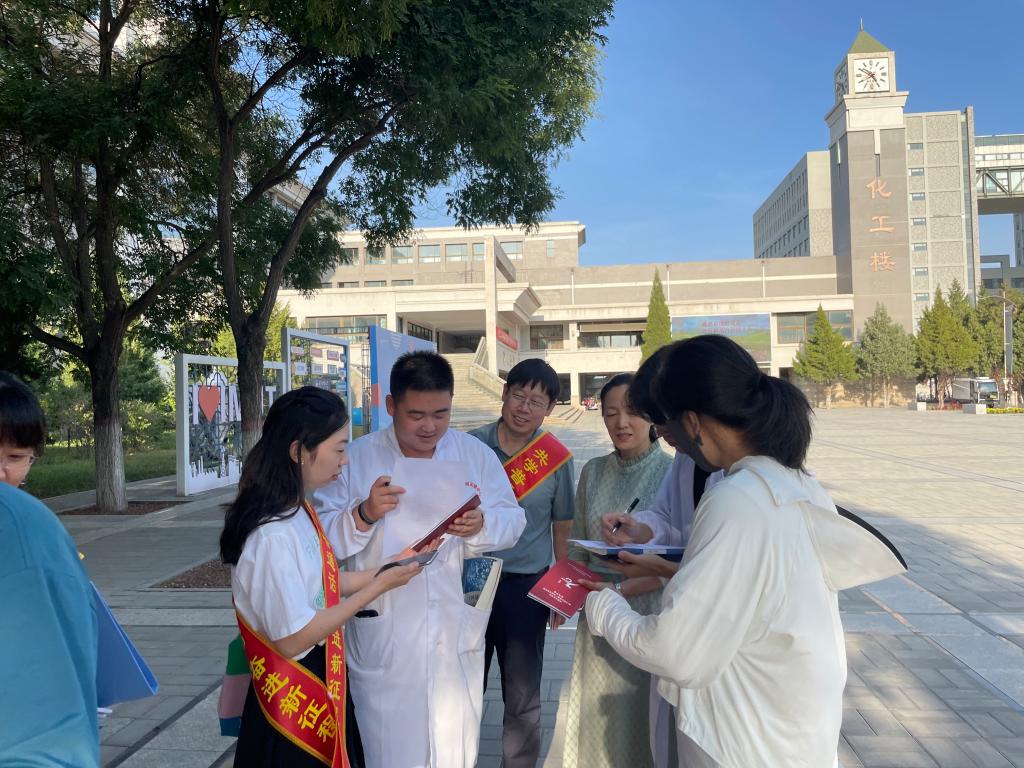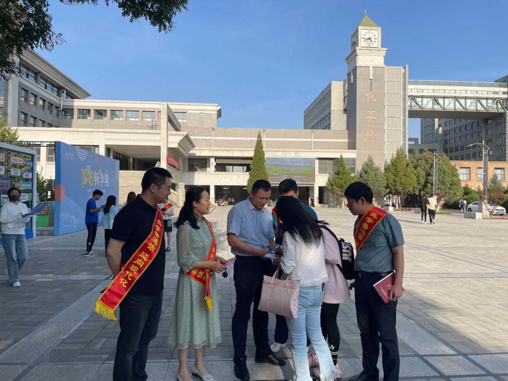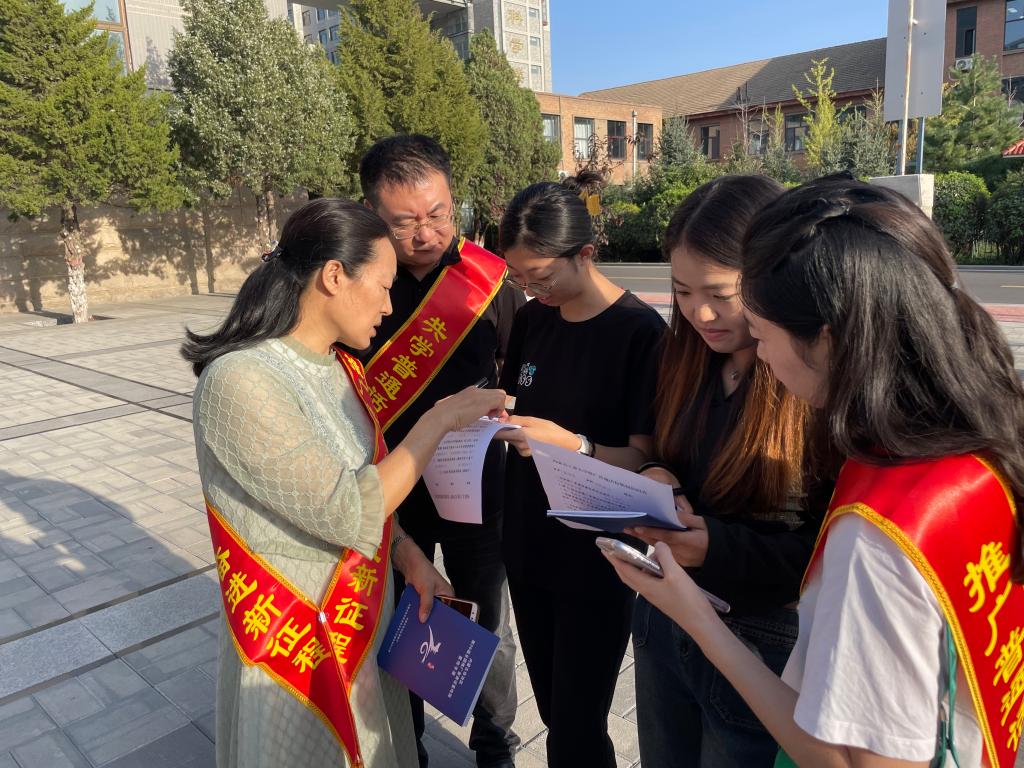 党员们身披印有“共学普通话 迈向现代化”“推广普通话 奋进新征程”的绶带,向往来学生发放《beat365官方网站推广普通话有奖知识问答》测试题,为获得满分的学生发放纪念品。同时,调研学生使用普通话和参与全国普通话水平测试情况。党员们还向学生阐释推广使用国家通用语言文字和铸牢中华民族共同体意识的关系,号召大家积极参与推广普通话,增进各民族学生交往交流交融,在学业上共同进步。