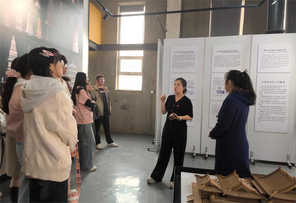参观学习期间,建筑系教工党支部宣传委员托亚从内蒙古传统建筑演变历史及建筑文化视角下各民族交往交流交融实例的角度,为全体学员带来了一堂生动的党课。全体学生紧跟老师步伐,仔细参观各类建筑等比模型、数字辽塔、实物展品和最新研究成果展图,聆听讲解,不时进行互动。