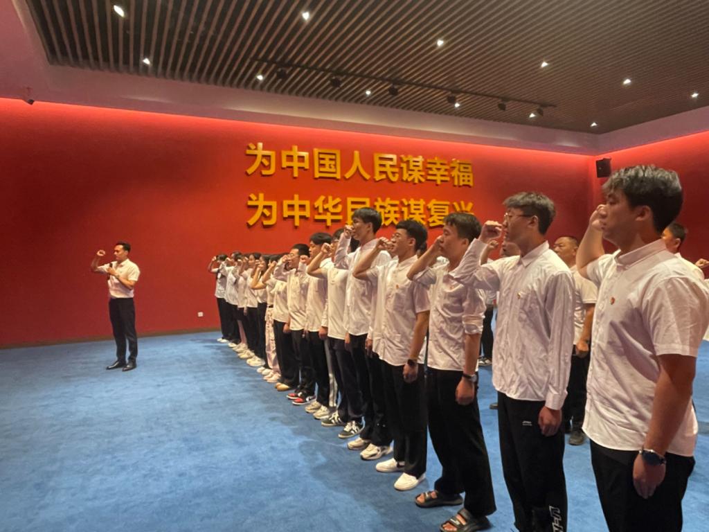 师生党员通过参加升国旗仪式、参与红歌快闪、观看红色展览等方式探寻红色足迹,感悟红色精神。随后,所有党员集体步入宣誓大厅,在领誓人带领下,新发展党员入党宣誓、老党员重温入党誓词。
