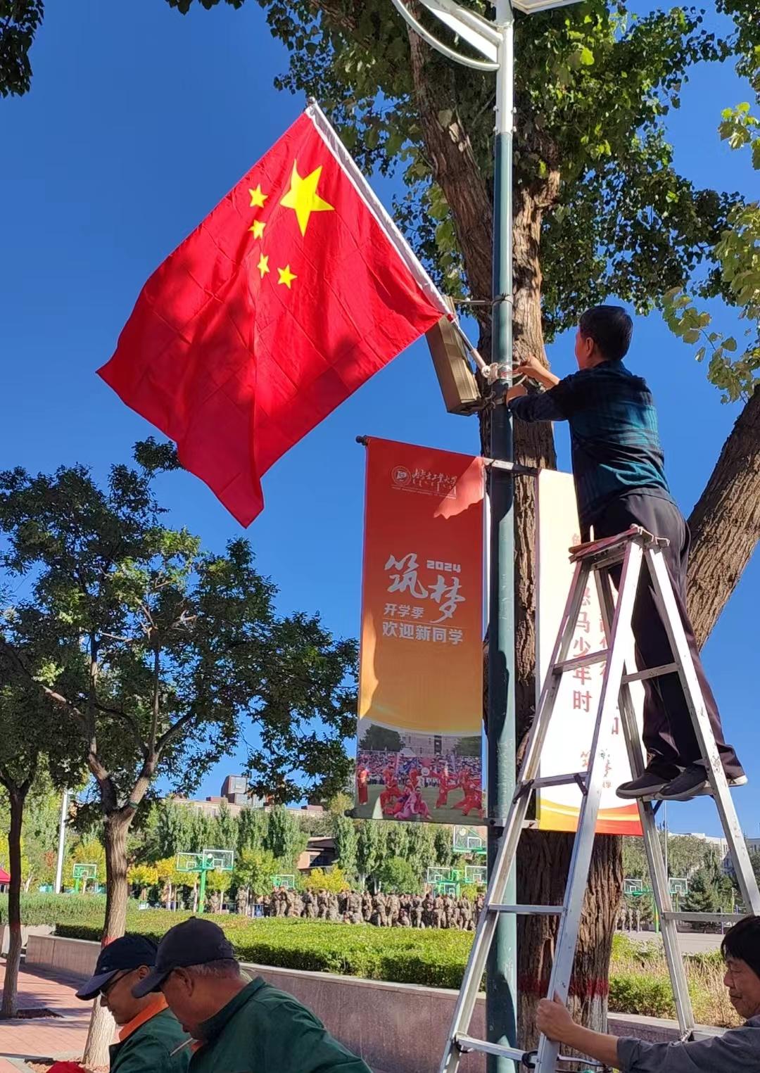 上午9时许,支部党员协同物业人员在校园各条主路悬挂国旗200余面。鲜艳的五星红旗迎风飘扬,与校园秋色相映成景,营造出一片庄严喜庆、文明和谐的节日氛围。