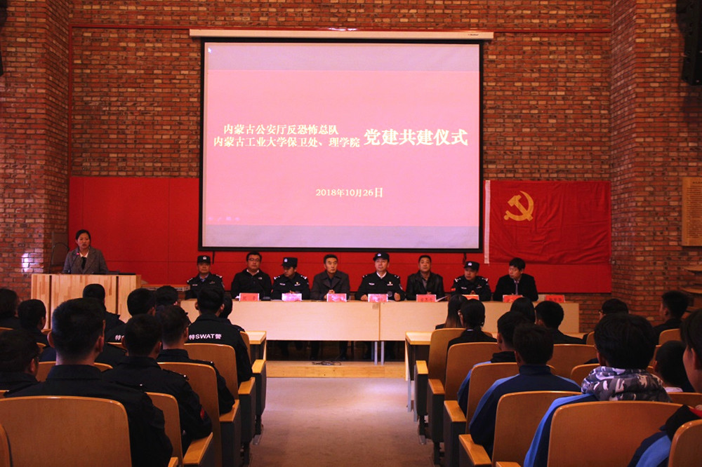 为深入贯彻落实习近平新时代中国特色社会主义思想和党的十九大精神,切实加强国家安全宣传教育,进一步增强党的基层组织的凝聚力和战斗力,创新党的基层组织教育活动形式,有效搭建结对共建平台,10月26日上午,理学院党委、机关党委保卫处党支部与内蒙古公安厅反恐怖总队党支部联合开展党建共建活动。内蒙古公安厅反恐怖总队党支部书记、总队长王建国,侦查支队长郭迎俊,突击支队长梁永胜等一行54人全程参加共建活动。beat365党委宣传部、理学院党委、机关党委保卫处党支部等单位负责人参加活动。共建三方先后开展了共建协议签订、党建工作经验交流、反恐知识宣传等。党建共建协议签订仪式上,共建三方党组织书记共同签订党建共建协议书,梁永胜带领全体与会党员重温入党警词。党建工作经验交流会上,共建三方围绕各自党建工作开展情况和工作特色亮点等进行了深入交流。