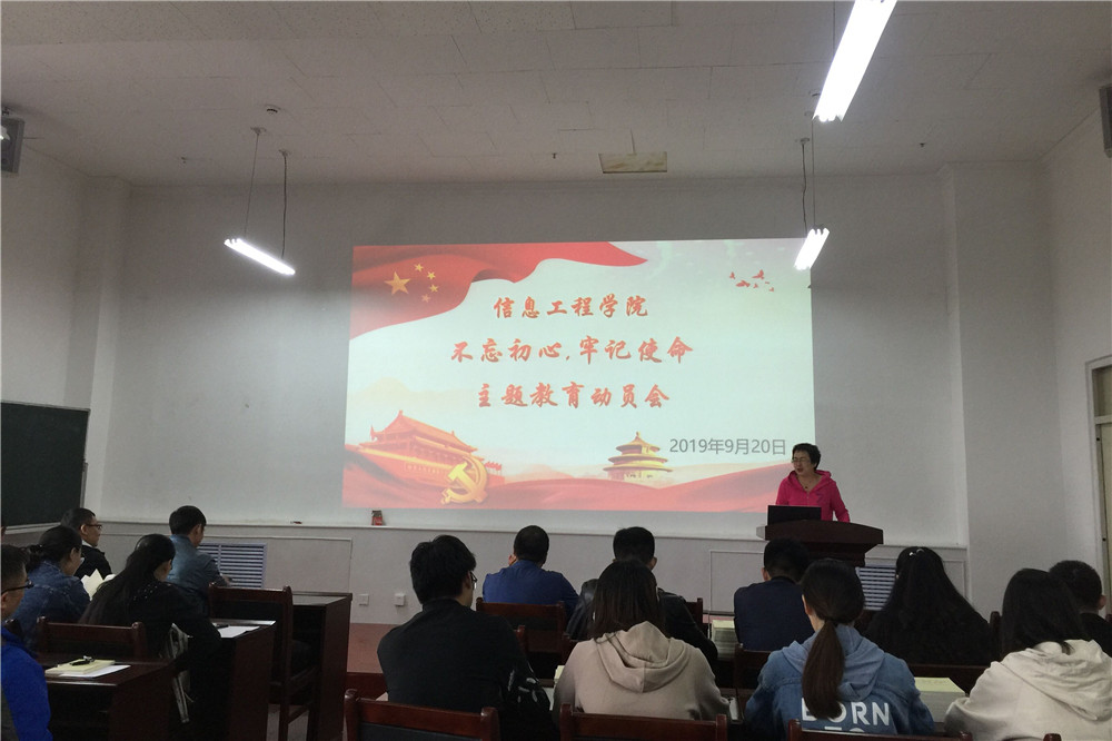 9月20日上午,信息工程学院党委在电力大楼十楼会议室召开“不忘初心、牢记使命”主题教育动员会。学院党委书记王彩玲主持会议,学院党委委员、各党支部书记、支部委员参加会议。