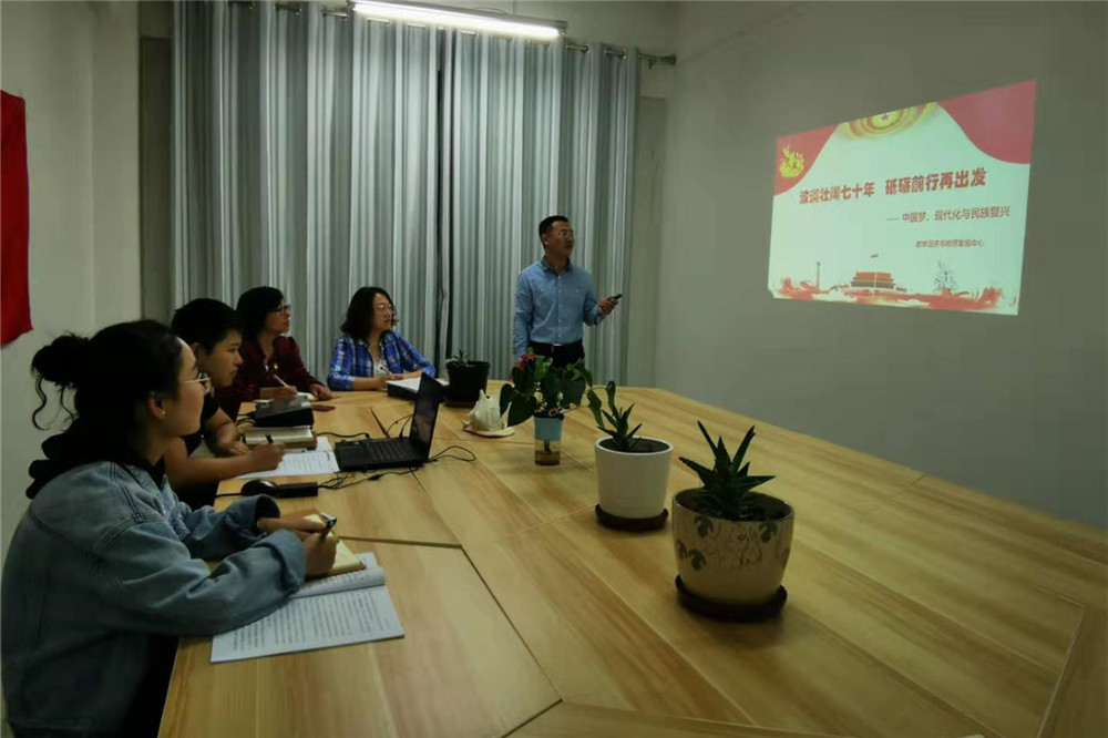 9月26日下午,机关党委教学促进与教师发展中心党支部召开“不忘初心、牢记使命”主题教育集中学习。赵剑峰同志领学了《习近平新时代中国特色社会主义思想学习纲要》中 “坚持以人民为中心”“实现中华民族复兴的中国梦”等内容。党员们进行了深入的交流和讨论。