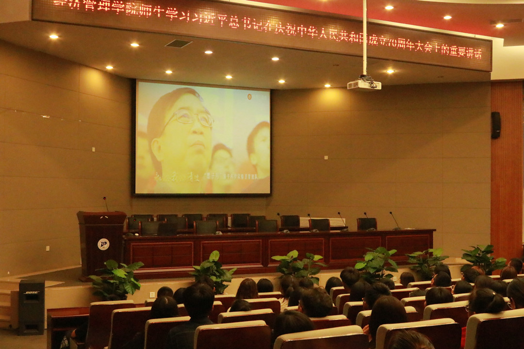 为深入推进学院“不忘初心、牢记使命”主题教育,10月8日晚,经济管理学院在新城校区图书馆报告厅组织学生党员学习习近平总书记在庆祝中华人民共和国成立70周年大会上的重要讲话,学院团学办公室副主任贾国辉主持活动,学院全体学生党员、普通学生代表200余人参加。