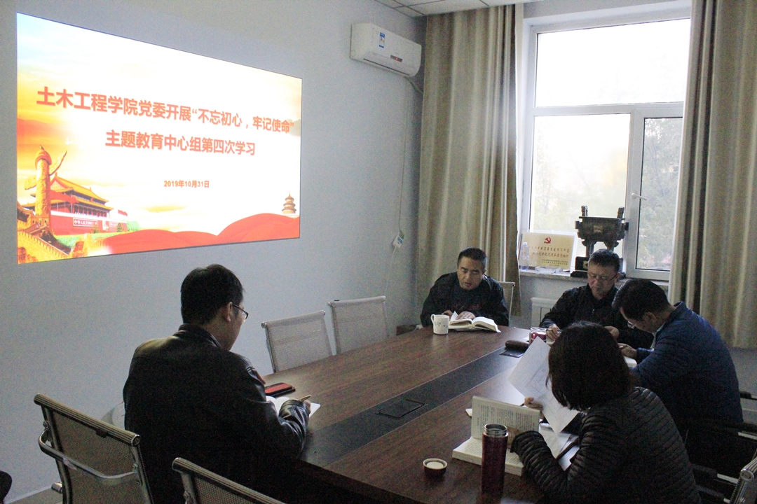 10月31日下午,土木工程学院党委中心组在新城校区土木馆C座小会议室开展“不忘初心、牢记使命”主题教育读书报告会。报告会由学院党委书记那音巴雅尔主持,学院领导班子共五人参加。