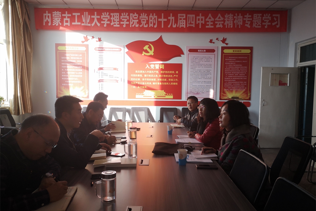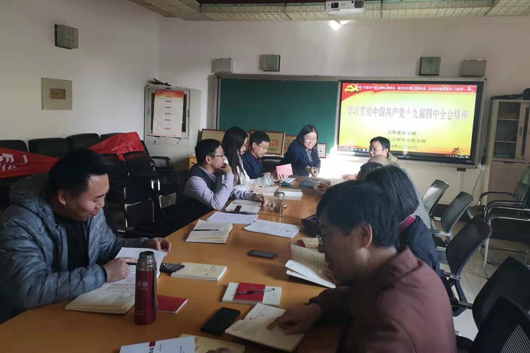 党的十九届四中全会于2019年10月28日至31日在北京举行,会议公布了《中国共产党第十九届中央委员会第四次全体会议公报》。11月11日,理学院组织召开党委中心组学习会对《公报》进行了深入学习,并对全院进行了学习部署。11日至15日期间,全院掀起了学习贯彻十九届四中全会精神的热潮。
