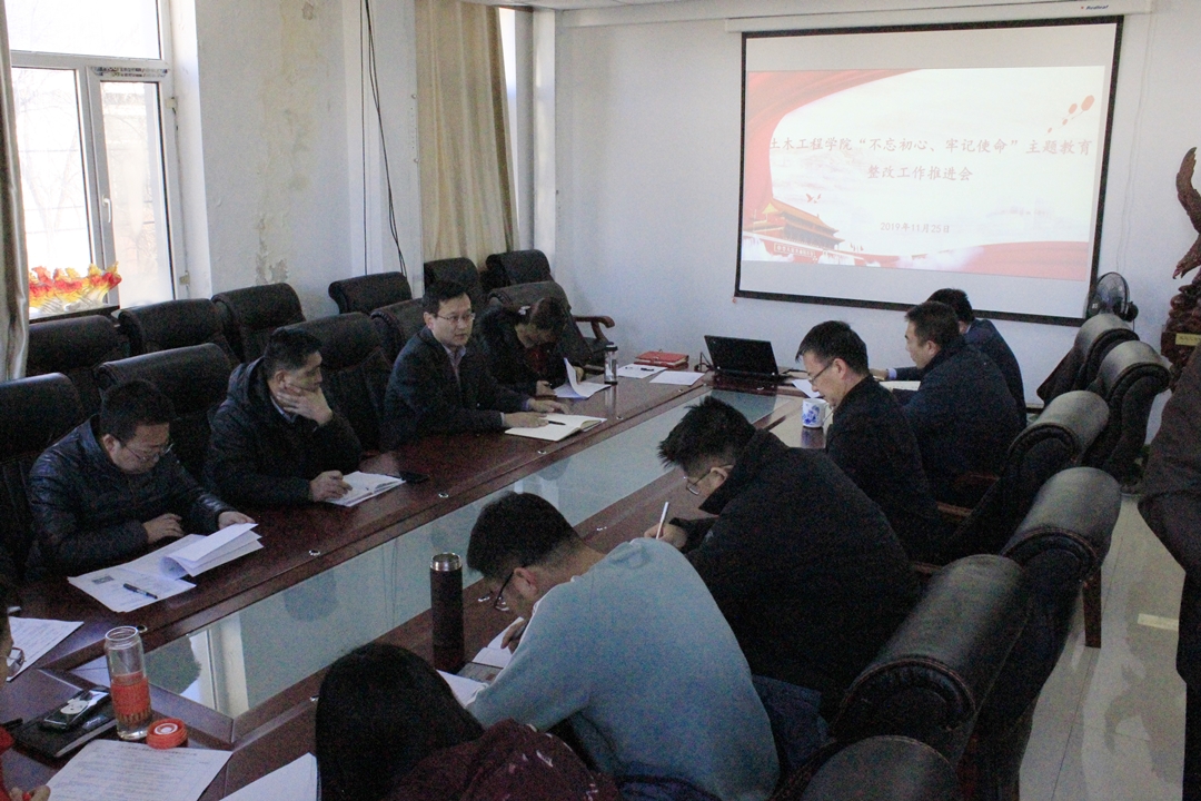 11月25日下午,土木工程学院党委在土木馆C座333会议室召开“不忘初心、牢记使命”主题教育整改工作推进会,学院党委书记那音巴雅尔主持会议,院领导、各系(实验中心)主任、教工党支部书记及各科室主要负责人参会。