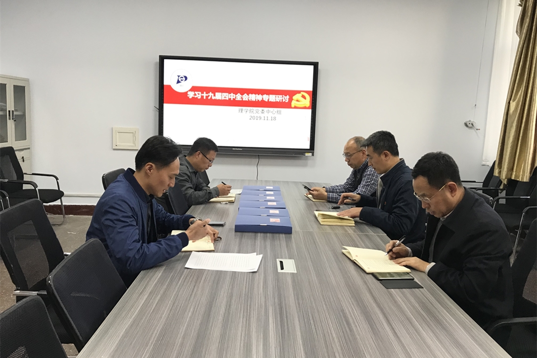 11月18日下午,理学院党委理论学习中心组召开党的十九届四中全会精神学习研讨会。党委书记姜鑫主持会议并讲话,院领导班子成员结合分管工作作交流发言,中心组成员参加会议。