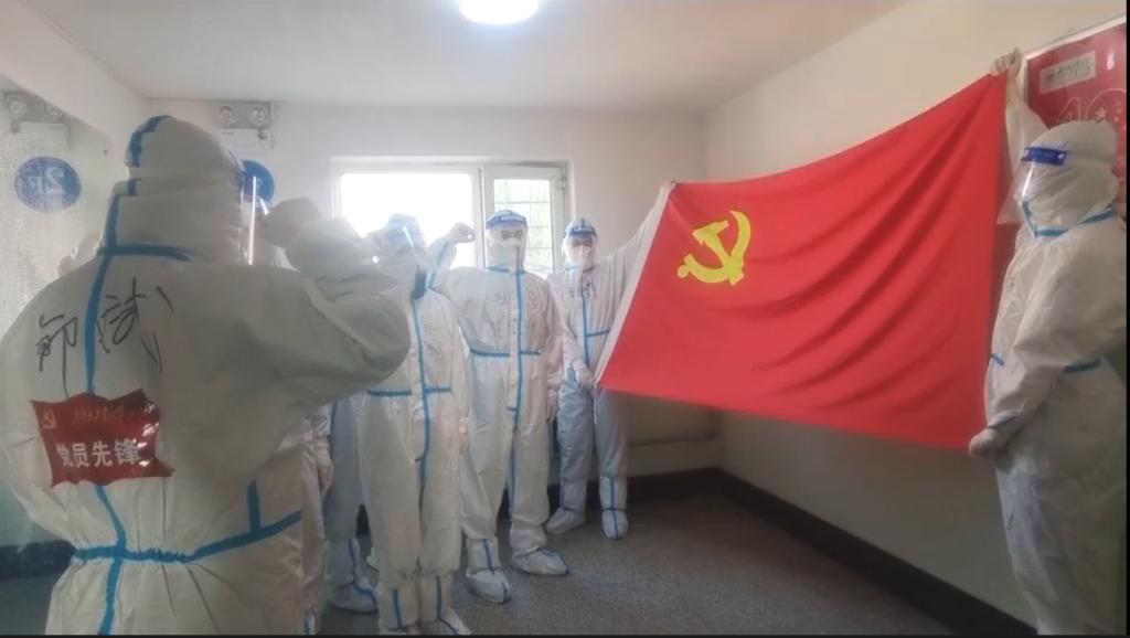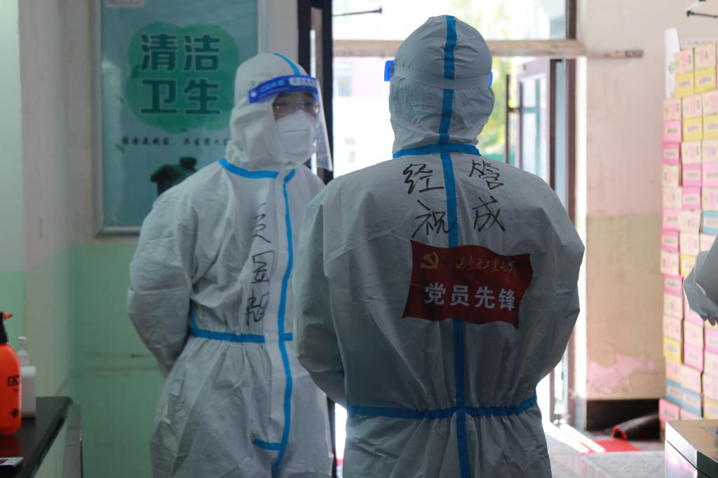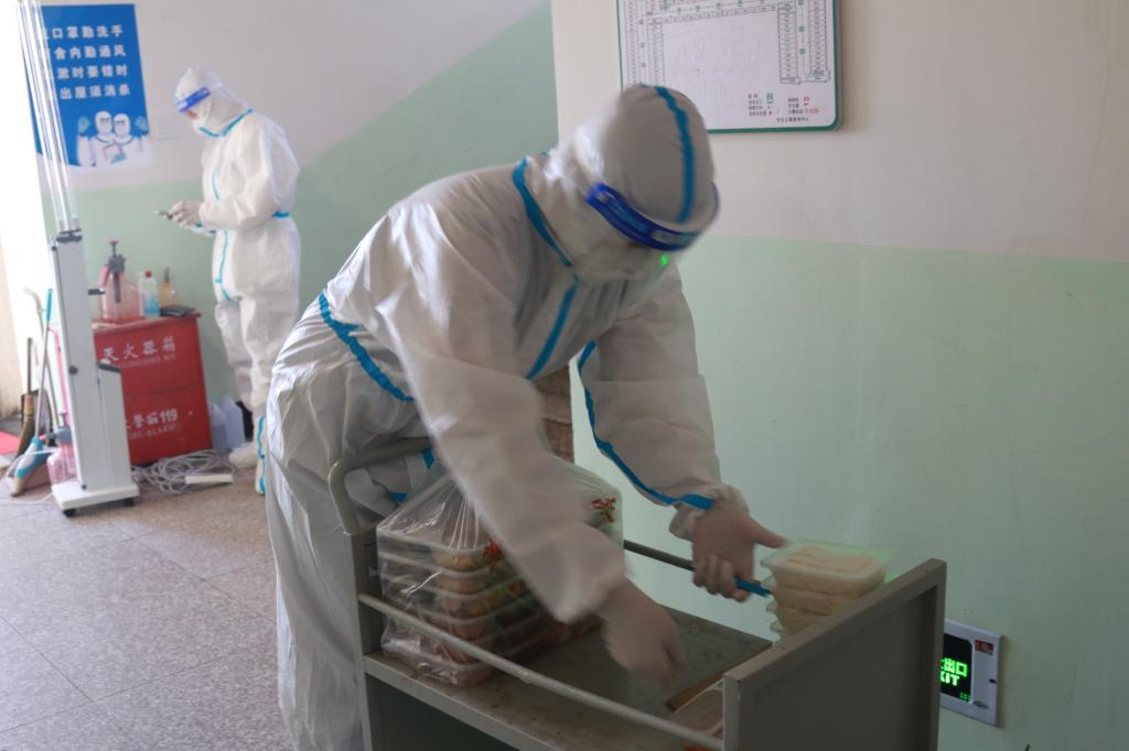 哪里有疫情,哪里就有党组织和党员忙碌的身影;哪里困难多,哪里就有党组织和党员坚定的声音。为确保整栋男生公寓1400余人的基本需求,4名党员带领20余名入党积极分子和志愿者,义无反顾奔赴抗疫一线。每天4000余份餐食,每次数十箱物资,几十斤的箱子在他们的肩上穿梭在一到六层,防护服下湿透的衣衫也未让他们停下脚步。