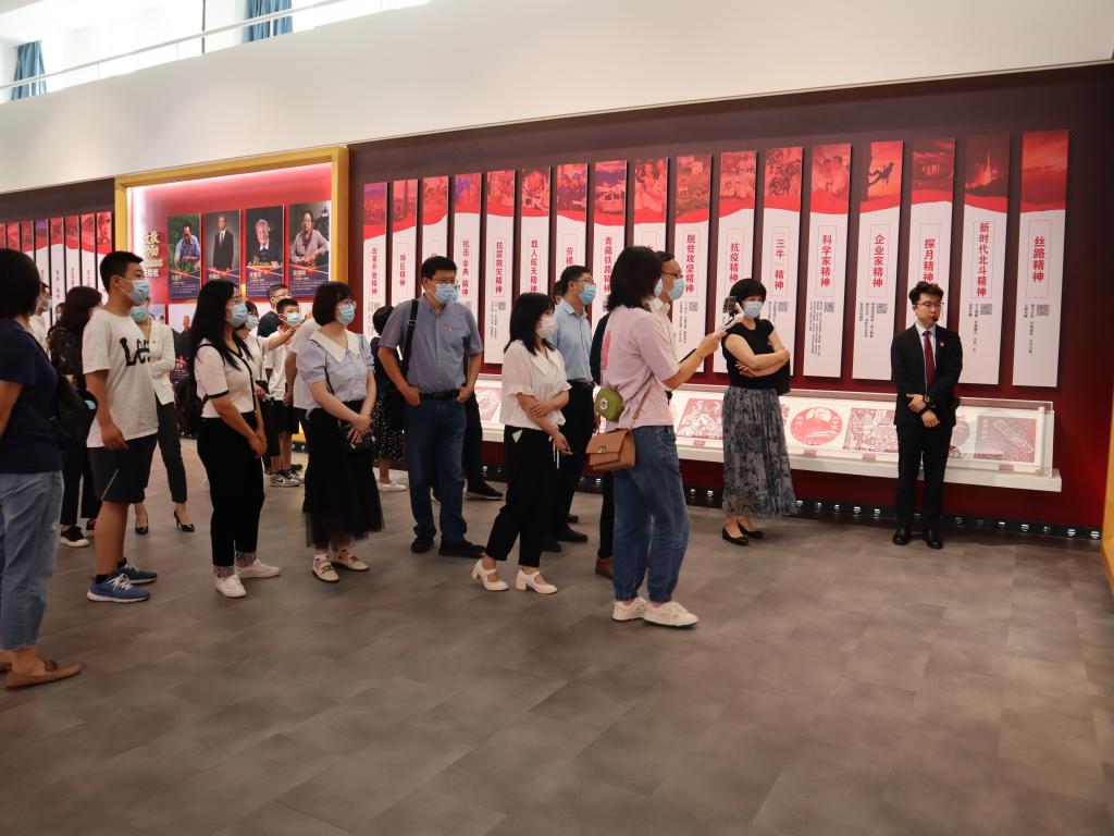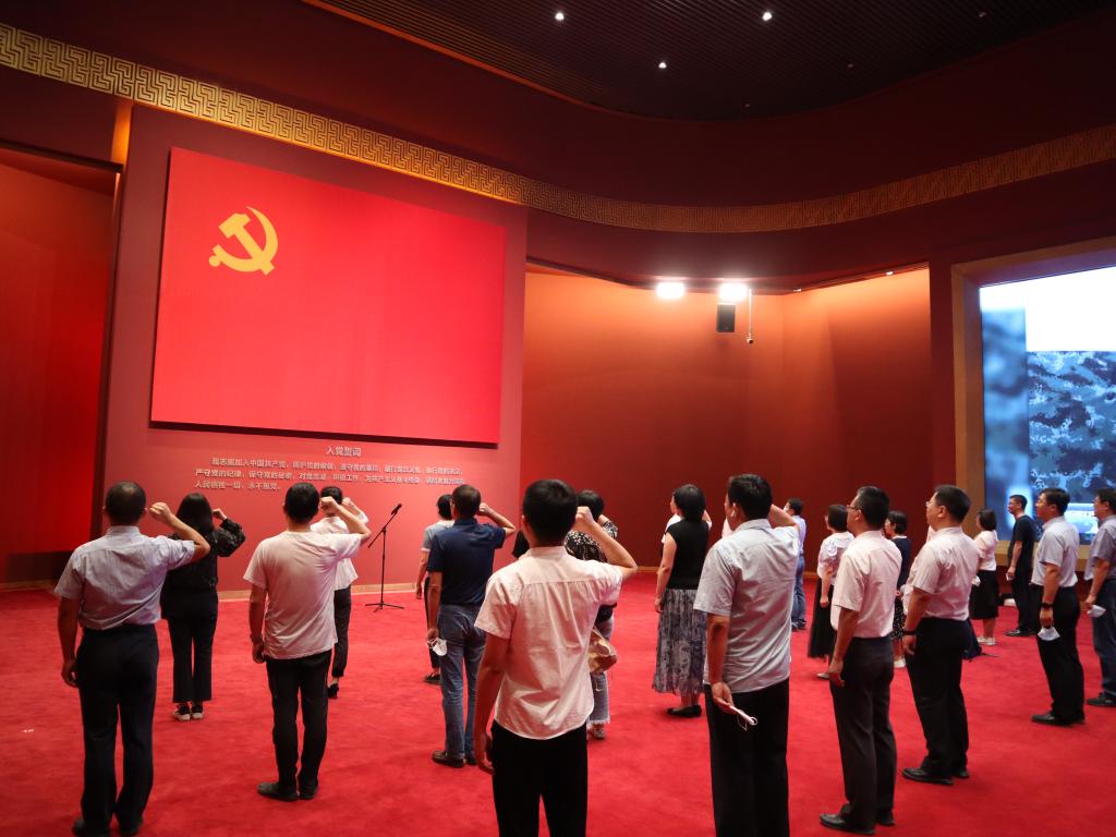 大家在讲解员的带领下依次参观“中华颂——我们心中的模样”综合展、内蒙古长城四季非遗展、内蒙古黄河非遗美术作品展,认真聆听讲解,详细询问有关情况,不时驻足察看文献资料、热烈交流讨论。在展览馆主题教育厅,面对鲜红的党旗,同志们举起右拳,重温了入党誓词。